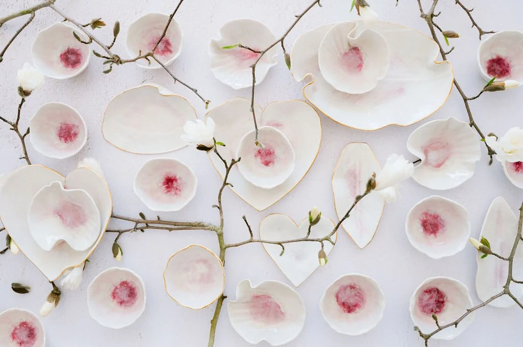 Delicate hand formed hearts in varying shades of pale pink. The perfect place to hold your favorite jewels or serve up Valentine’s Day chocolates.
